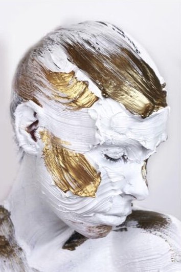 Using her skin as the canvas, impasto paint is placed sculpturally onto her face, before being rendered flat through digital photography, the image is then re-animated, by thick lashings of paint being applied heavily across the mounted surface.